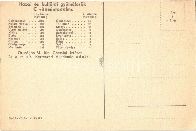 Description: Fürdőzéskor gyümölcs! Magyar egészségügyi propaganda, C-vitamin táblázat a hátoldalon. M. kir. Földművelődésügyi Minisztérium kiadványa / Hungarian health campaign propaganda, Vitamin C chart s: Garamvölgyi K.
