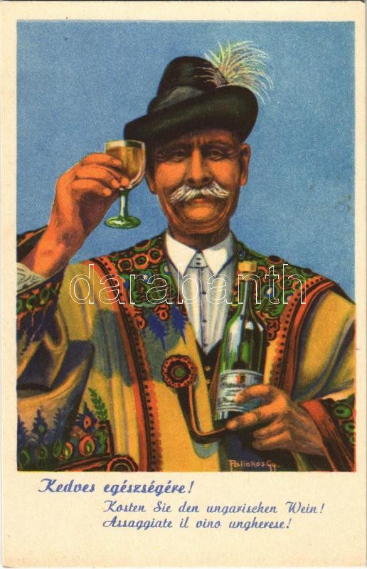 Kedves egészségére! Magyar bor reklámlap, folklór / Hungarian wine advertising propaganda, folklore s: Pálinkás Gy.