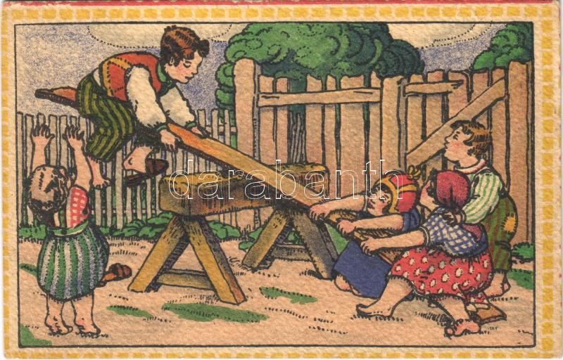 1920 Children art postcard, seesaw. Salon International D.K. & Co. P. 2238. s: A. Kloubek-Schrutz (EK)