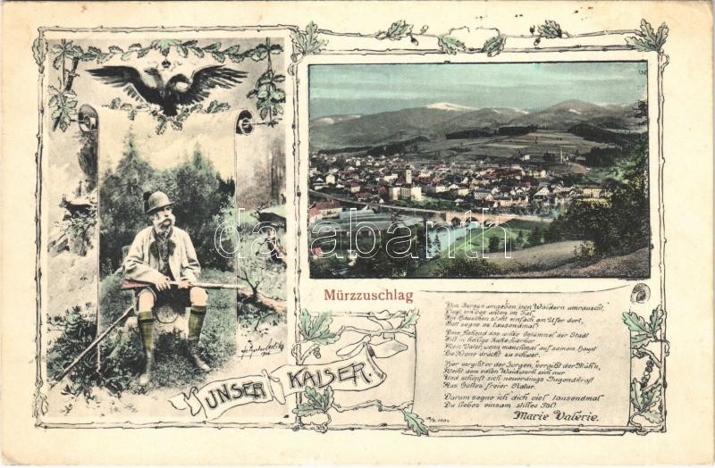1913 Mürzzuschlag, Unser Kaiser Franz Josef / Franz Joseph with guns during hunting. Art Nouveau, floral