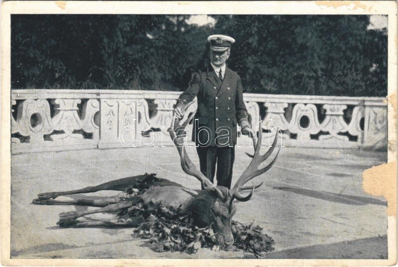 Horthy Miklós, Magyarország kormányzója az általa lÅ‘tt szarvasbikával a gödöllÅ‘i Királyi kastély teraszán. Krummer G. felvétele. KészÃtette a Hungária Nyomda. Storcz B. Mátyás kiadása / Regent Admiral Miklós Horthy with trophy stag (felületi sérülés / surface damage)