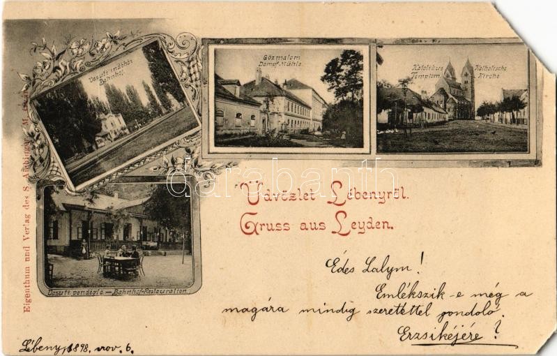 1898 Lébény, Vasúti indóház, vasútállomás, gőzmalom, Katolikus templom, Vasúti vendéglő, étterem. Kiadja S. Aichinger. Art Nouveau, floral (EM)