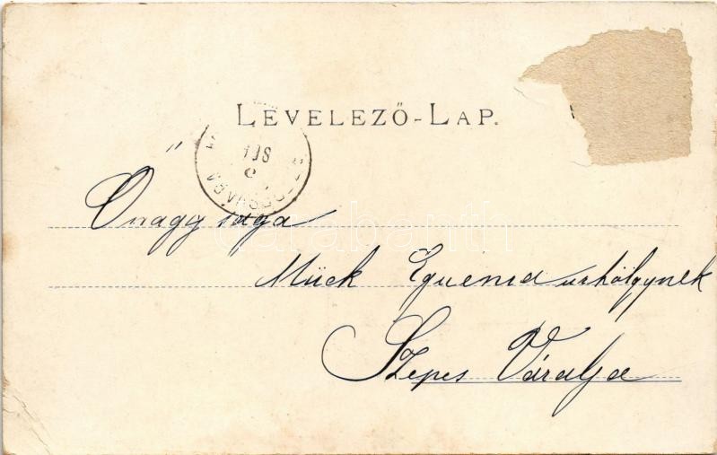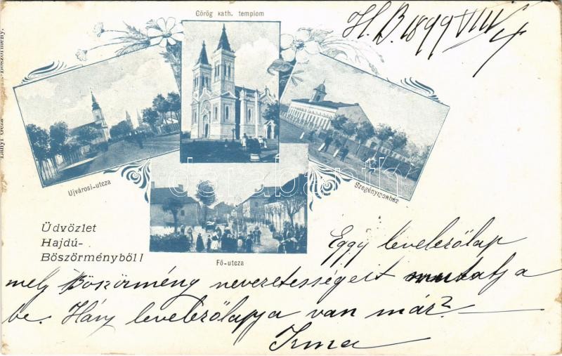 1899 (Vorläufer) Hajdúböszörmény, Görögkatolikus templom, Szegénymenház, Fő utca, piac, Újvárosi utca. Lányi Géza kiadása. Art Nouveau, floral (Rb)