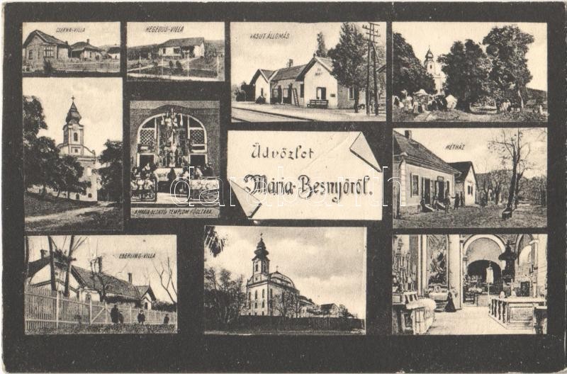 1923 Máriabesnyő (Gödöllő), Vasútállomás, Cserna villa, Hegedűs villa, Hétház, Eberling villa, Kegytemplom, főoltár, búcsújáróhely. Reich Miksa kiadása