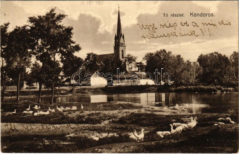 1928 Kondoros, Tó részlet, Evangélikus templom. Nagy János kiadása (EK)
