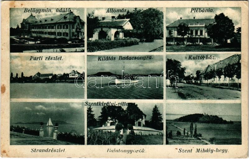 1935 Balatongyörök, Belügyminisztériumi üdülő, vasútállomás, plébánia, parti részlet, kilátás Badacsonyra, Kultúrház, strand, Szentkirályi villa, Szent Mihály-hegy. Malek Károly kiadása (Rb)