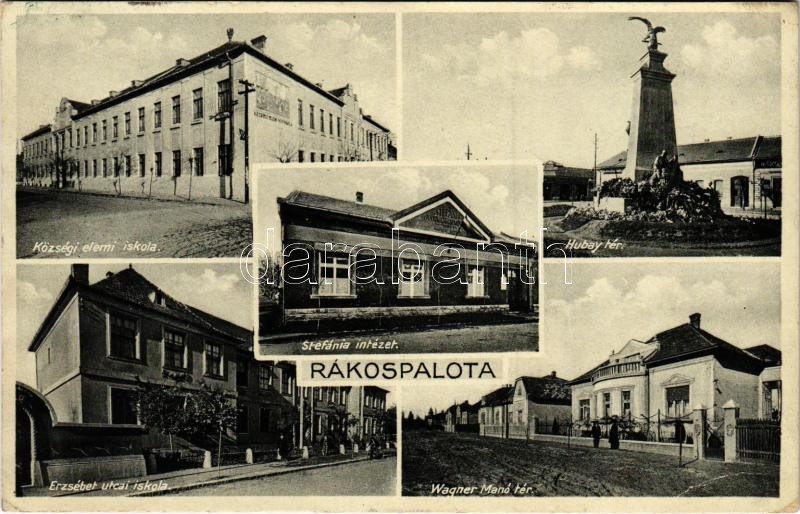 1937 Budapest XV. Rákospalota, Községi elemi iskola, Hubay tér, hősök szobra, Erzsébet utcai iskola, Wagner Manó tér, Stefánia intézet