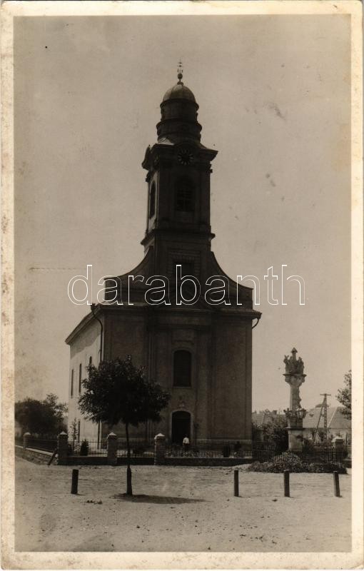 1939 Besenyőtelek, Római katolikus templom, Szentháromság szobor. Kádár fényképész kiadása (fl)