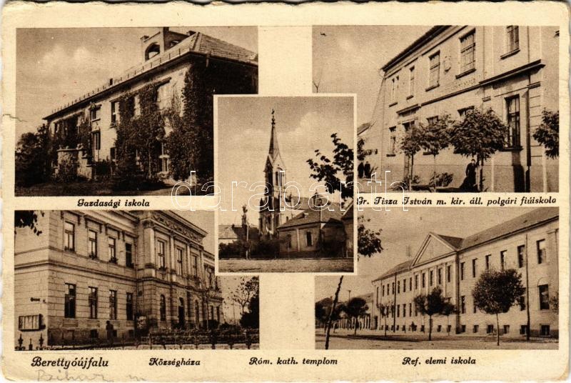 Description: 1944 Berettyóújfalu, Gazdasági iskola, Gróf Tisza István m. kir. állami polgári fiúiskola, Községháza, Római katolikus templom, Református elemi iskola (kis szakadás / small tear)