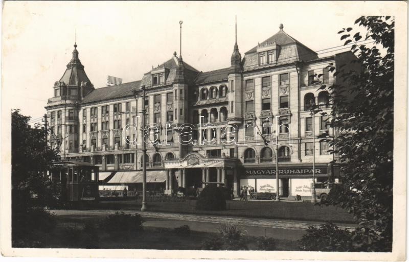 Debrecen, Arany Bika szálló, Magyar Ruhaipar üzlete, vvillamos, autók