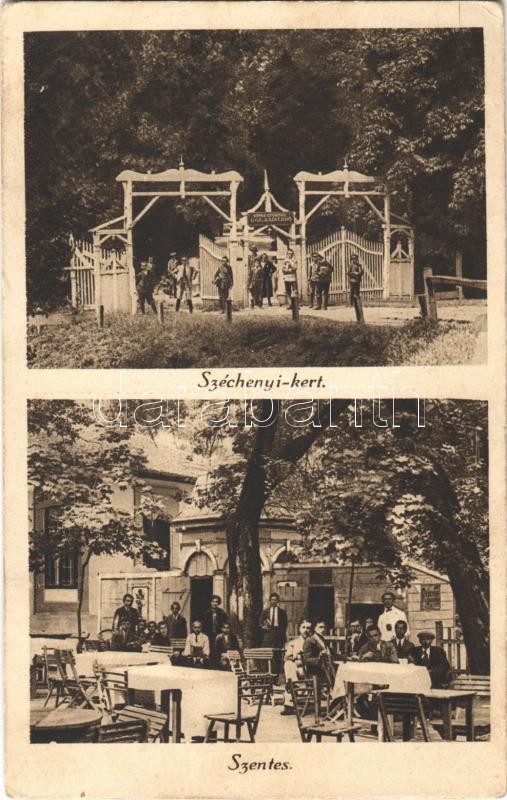 Szentes, Széchenyi kert, kénes gyógyvíz, gőz és kádfürdő, vendéglő, étterem, kert vendégekkel és pincérekkel. Ifj. Molnár Ferenc kiadása (EK)