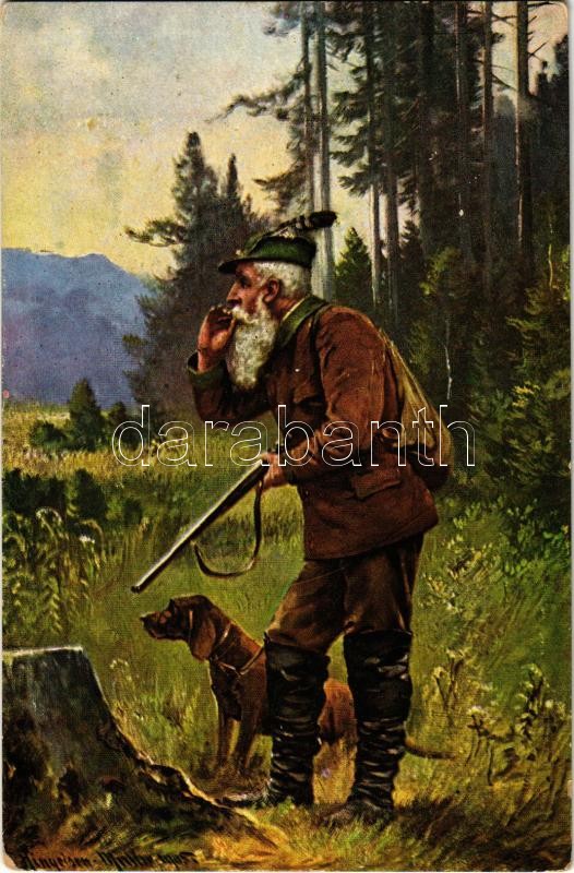Vadász cigarettával és puskával / Hunter smoking a cigarette, gun. K.V.B. Serie 9007. s: Ringeisen-Müller (fl)