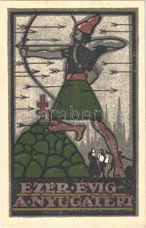 Description: Ezer évig a Nyugatért! Kiadja Magyarország Területi Épségének Védelmi Ligája. Besskó Károly Grafikai Műintézete / Hungarian irredenta propaganda, Trianon s: Wenczel Márton