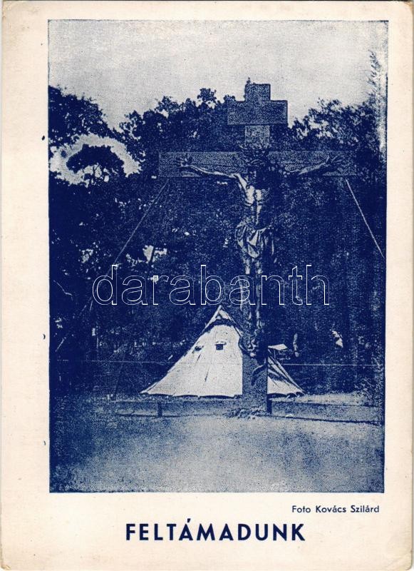 1933 Feltámadunk! A kép bal sarkában, Krisztus jobb kezénél a falombok a természet csodálatos játékából Nagy-Magyarország és Csonka-Magyarország képeit mutatják. Kiadja a Magyar Nemzeti Szövetség. Kovács Szilárd felvétele. Gödöllő IV. Cserkész Jamboree / Hungarian boy scout camp, Hungarian irredenta propaganda, Trianon, World Scout Jamboree (EK)