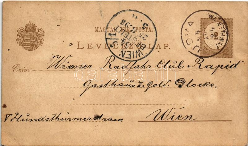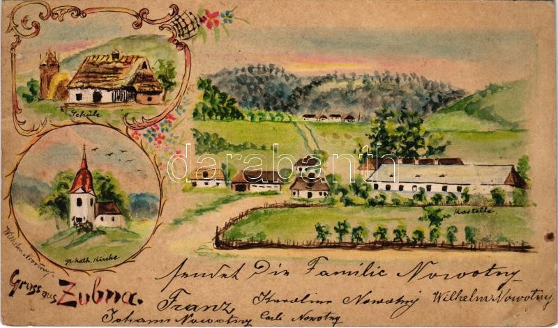 1898 (Vorläufer) Tölgyeshegy, Zubna, Zubné (Homonna, Humenné); iskola, kastély, görög katolikus templom. Wilhelm Novotny saját kézzel rajzolt szecessziós képeslapja / school, castle, church. Art Nouveau, floral, hand-painted postcard + "UDVA ZEMPLÉN VM" (EK)