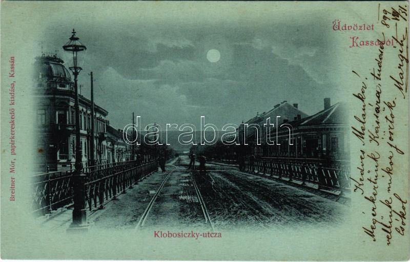 1899 (Vorläufer) Kassa, Kosice; Klobusiczky utca, Urbán üzlete. Breitner Mór kiadása / street view, shop