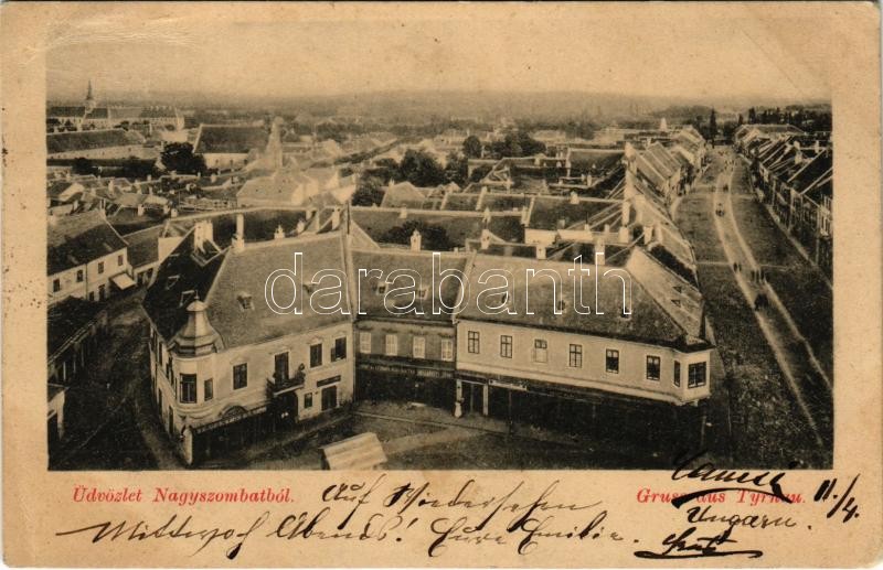 1899 (Vorläufer) Nagyszombat, Trnava; látkép, Minárovits János, Schmiedt Antal, Adolf Weiss üzlete / general view, shops (EB)
