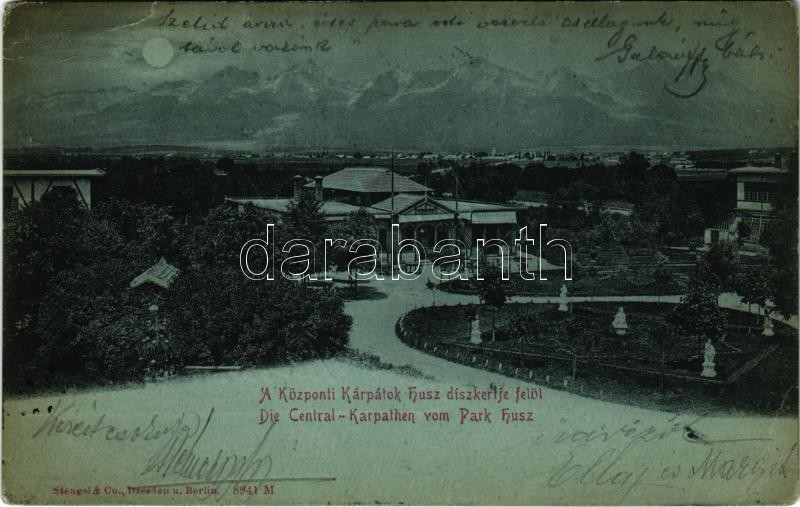 Description: 1900 Poprád (Magas-Tátra, Vysoké Tatry), Huszpark kávéház, Központi Kárpátok a Husz díszkertje felől / Die Central-Karpathen vom Park Husz / park, café (EB)