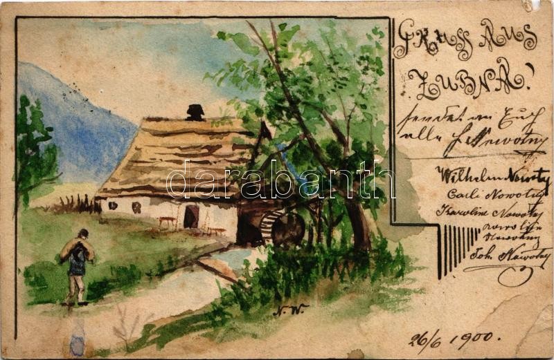1900 Tölgyeshegy, Zubna, Zubné (Homonna, Humenné); vízimalom. Wilhelm Novotny saját kézzel rajzolt szecessziós képeslapja / watermill. Art Nouveau, hand-painted postcard + "UDVA ZEMPLÉN VM" (szakadás / tear)