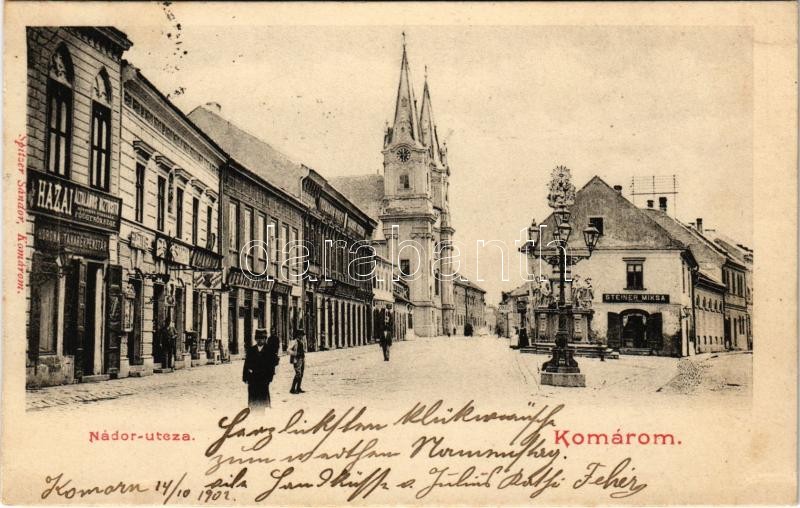 Description: 1902 Komárom, Komárno; Nádor utca, Hazai Általános Biztosító Rt. főügynöksége, Korona Takarékpénztár, Komárom-Vidéki Takarékpénztár, Steiner Miksa üzlete. Spitzer Sándor kiadása / street view, insurance company, savings bank, shops