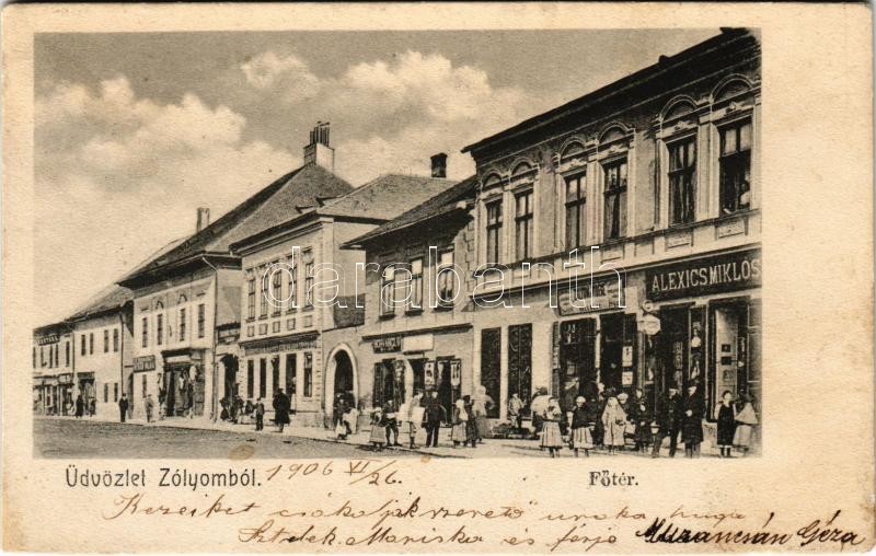 Description: 1906 Zólyom, Zvolen; Fő tér, Alexics Miklós és Schvarcz B. üzlete, Zólyom és Vidéke vállalat, takarékpénztár, vendéglő / main square, shops, restaurant, savings bank (r)