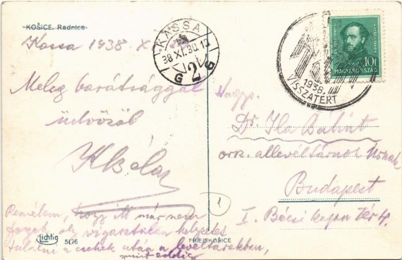1938 Kassa, Kosice; Radnica / városház / town hall + "1938 Kassa visszatért" So. Stpl