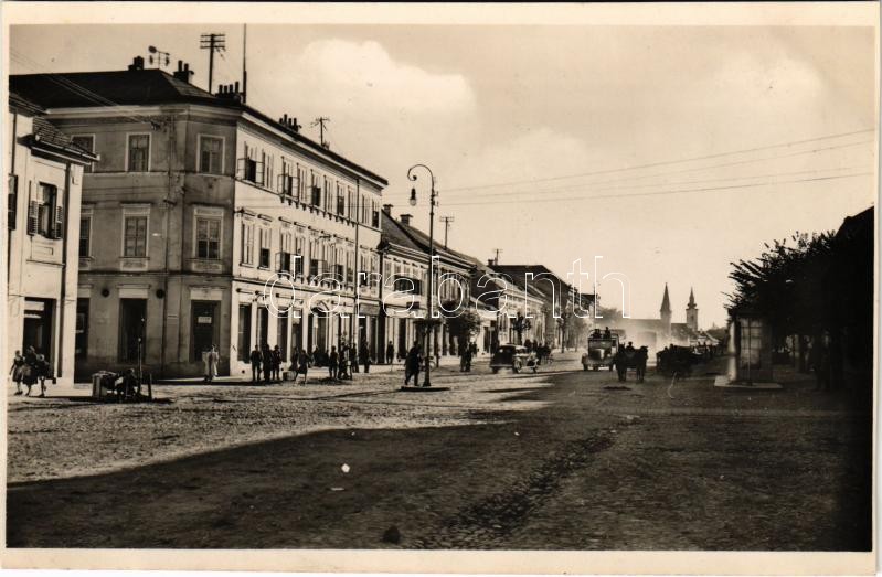 Description: 1942 Szászrégen, Reghin; Gróf Teleki Pál utca, Birthler üzlete, étterem, magyar katonák teherautóban / street view, shops, restaurant, Hungarian soldiers in a truck