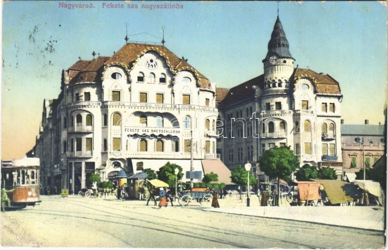 Nagyvárad, Oradea; Fekete Sas nagyszálloda, piac, villamos. Vidor Manó...