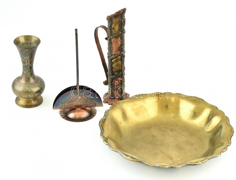 Vegyes réz tárgy tétel, tál, váza, szalvétatartó, kopásnyomokkal