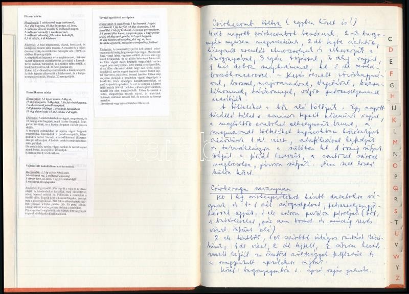 cca 1990-2000 Ételreceptek, kézzel írt vagy beragasztott ételreceptekkel.