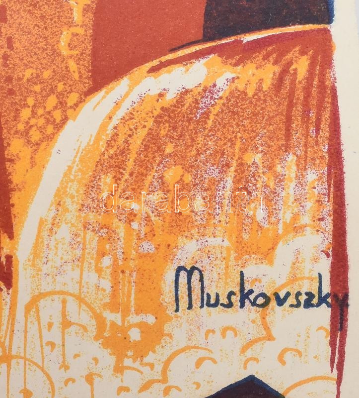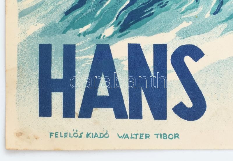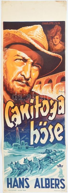 Canitoga hőse. Moziplakát (filmplakát, rácsplakát), 1939. Hans Albers, Charlotte Susa és mások szereplésével. Bawaria Film. Litográfia, papír. Muskovszky László (1902-?) grafikája, jelzett a litográfián. Kincs Emil nyomda. Lapszéli kisebb sérülésekkel, hiányokkal, felső részén kissé foltos. Hajtásnyomokkal. 94×31 cm / Vintage Hungarian poster of the German movie "Wasser für Canitoga" with Hans Albers, with smaller damages on the edges, lithography on paper.