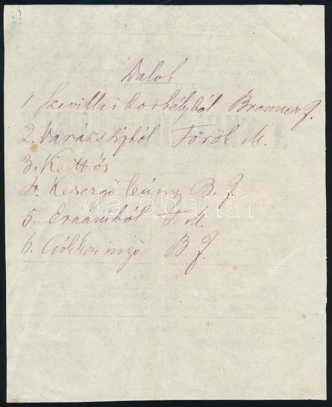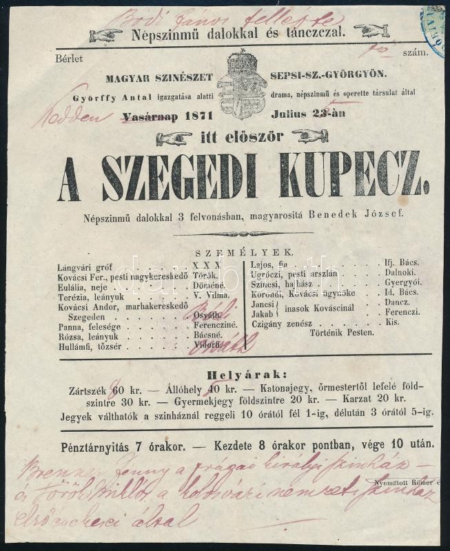 1871 A szegedi kupecz népszinmű plakátja, körbevágva. 15x20 cm Tintaceruzás javításokkal