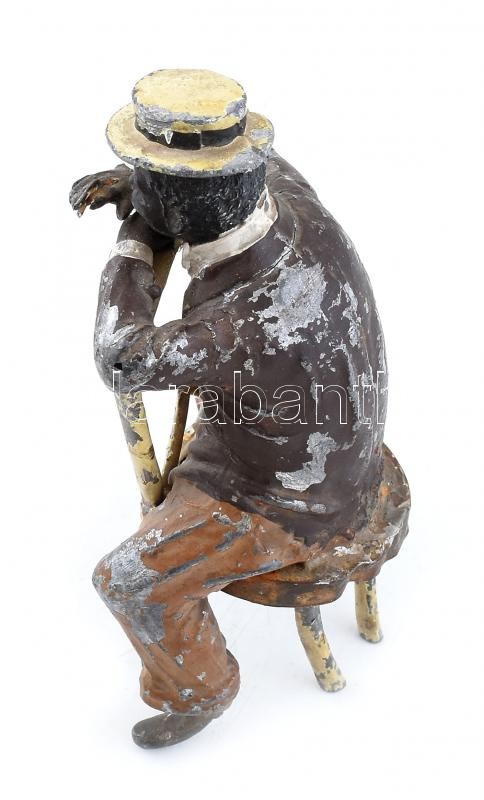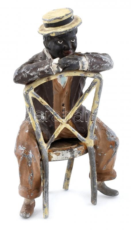 Széken ülő afroamerikai jazz zenész, hidegen festett alumínium, erősen kopott, jelzés nélkül. cca. 1920 körül m: 14cm