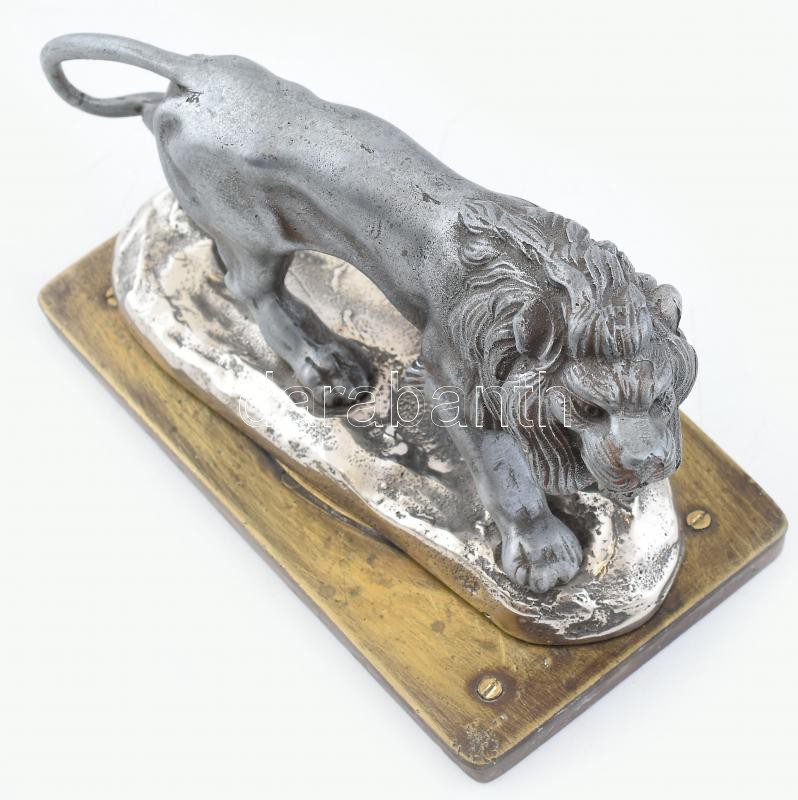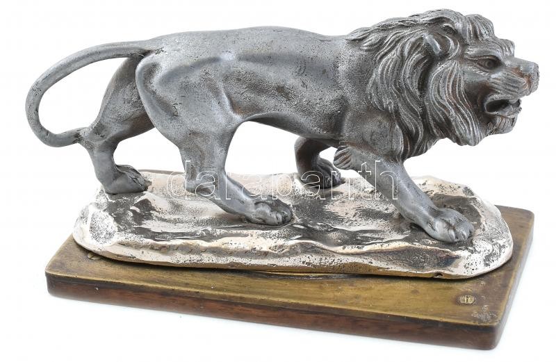 Üvöltő oroszlán, ón, réz és fa talapzaton. Jelzés nélkül, 17x9x9cm