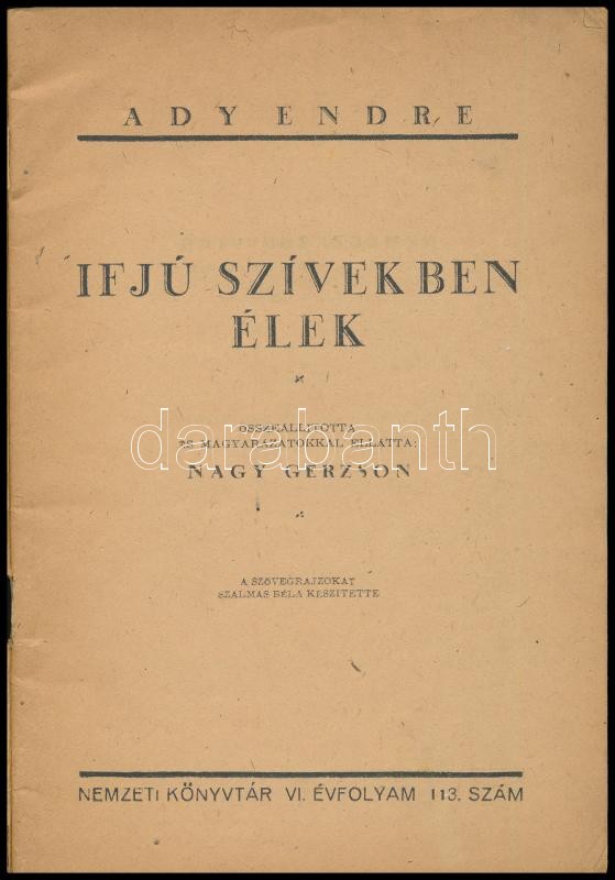 Ady Endre: Ifjú szívekben élek. Összeállította és magyarázatokkal ellá... https://www.darabanth.com/en/411-Online-auction/411.0/Books/Books-Other-rarities~1500021/Ady-Endre-Ifju-szivekben-elek-Osszeallitotta-es-magyarazatokkal-ellatta-Nagy-Gerzson-Ne~II2555018