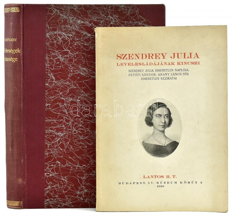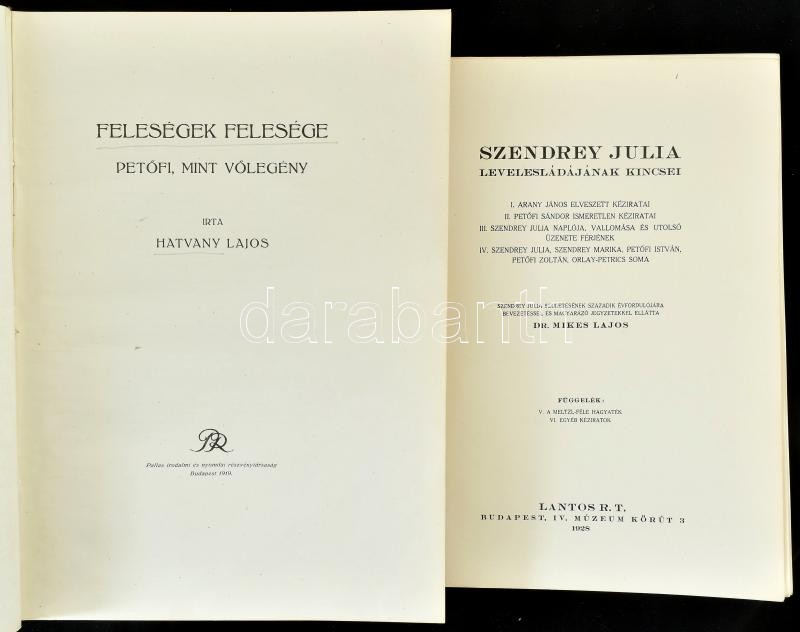 Hatvany Lajos: Feleségek, felesége. Petőfi, mint vőlegény. Bp., 1919., Pallas, 354 p.+6 t. +2 p. Átkötött aranyozott félvászon-kötés, a címlapon ceruzás aláhúzásokkal. + Szendrey Julia levelesládájának kincsei. Szendrey Julia ismeretlen naplója, Petőfi Sándor, Arany János...stb. ismeretlen kéziratai. Bp., 1928., Lantos Rt., 76+1 p. Kiadói papírkötés.