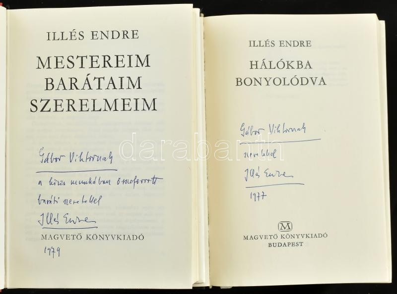 Illés Endre: Hálókba bonyolódva., Mestereim, barátaim, szerelmeim. Bp., 1977-1979, Magvető. Kiadói egészvászon kötések, kiadói papír védőborítókban, jó állapotban. A szerző, Illés Endre (1902-1986) író által Gábor Viktor, a Kulturális Minisztérium Kiadói Főigazgatóságának vezetője részére részére dedikált példányok.