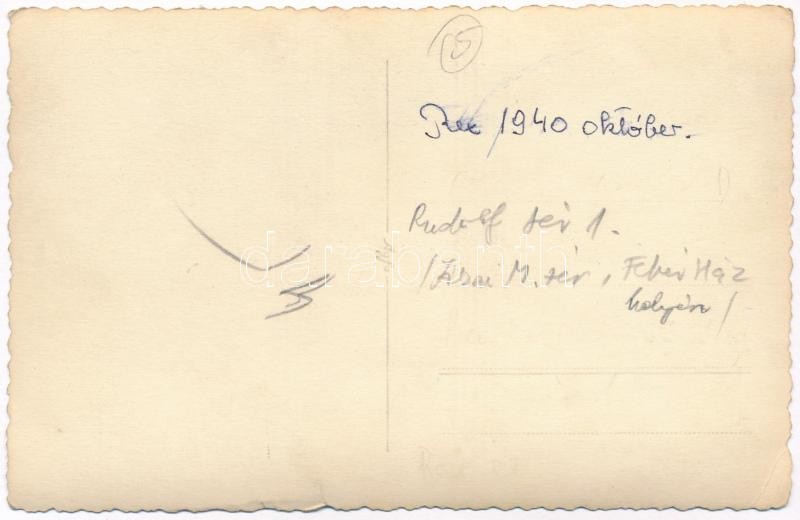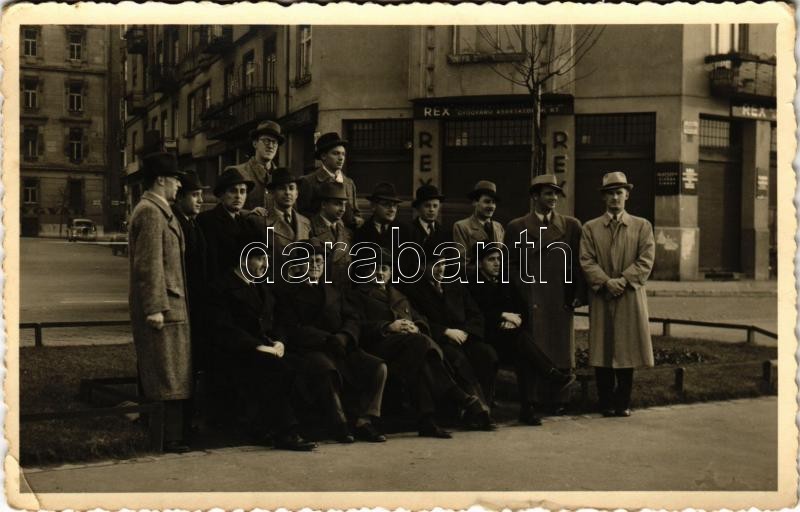 Description: 1940 Budapest XIII. REX Gyógyszervegyészeti gyár és Gyógyáru kereskedelmi rt. üzlete, csoportkép. Rudolf tér (ma Jászai Mari tér, a Fehér ház). photo (EK)