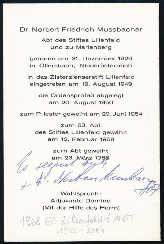 1968 Dr. Norbert Friedrich Mussbachr (1926-2004) lilienfeldi apát aláí...