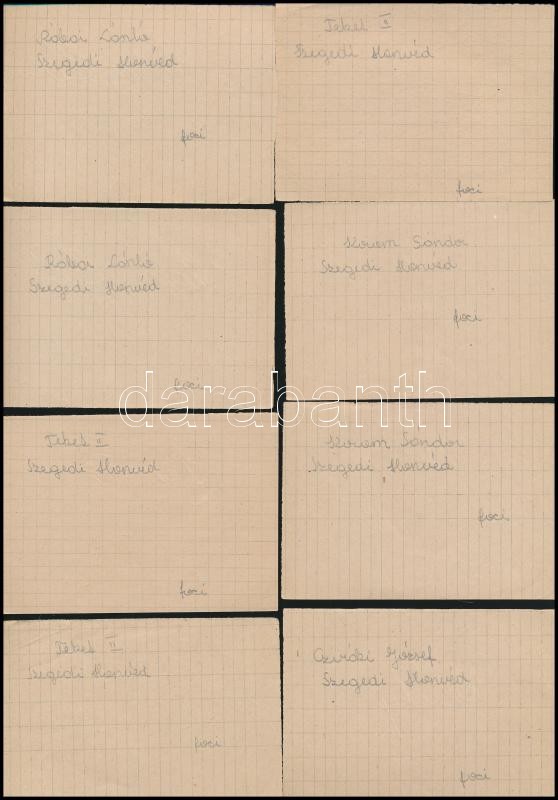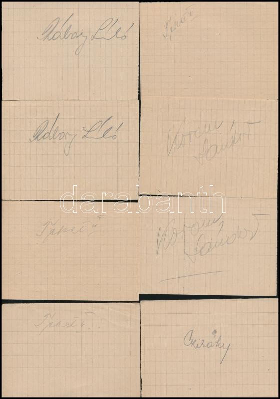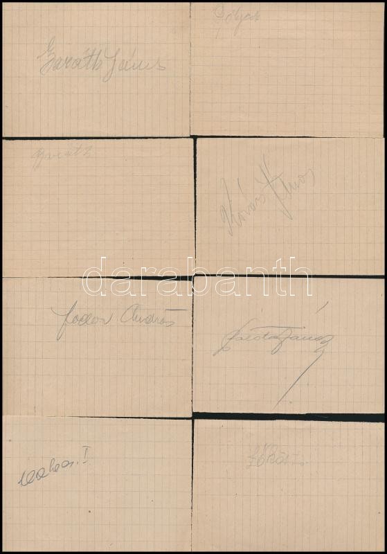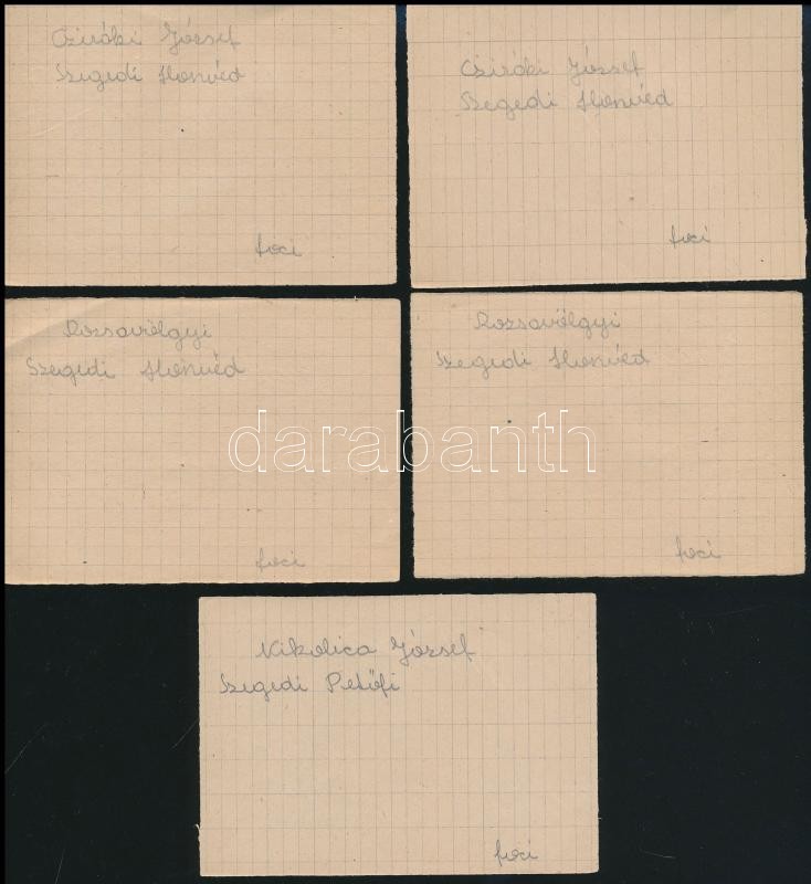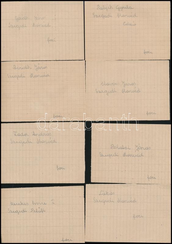 Szegedi Honvéd SE és Szegedi Petőfi (Szegedi AK) labdarúgó csapatok tagjainak aláírásai papírlapokon, közte ismétlődésekkel (Cziráki József (3 db), Rózsavölgyi (2 db), Teket László (3 db), Rábai László (2db), Korom Sándor (2 db), Baráth Jenő (2 db)), valamint az edző Polyák Gyula aláírásával, összesen 21 db