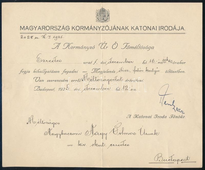 Description: 1925 Horthy Miklós kormányzó kormányzó kihallgatáson fogadja Nagybaczoni Nagy Vilmos (1884-1976) akkori ezredest, későbbi honvédelmi minisztert, értesítő a kormányzó katonai irodája által kitöltve, hajtott, szép állapotban