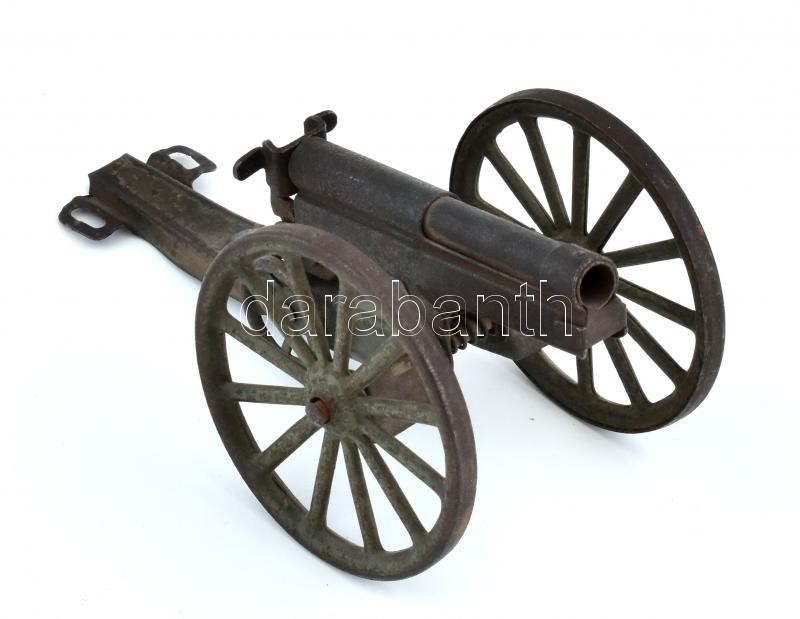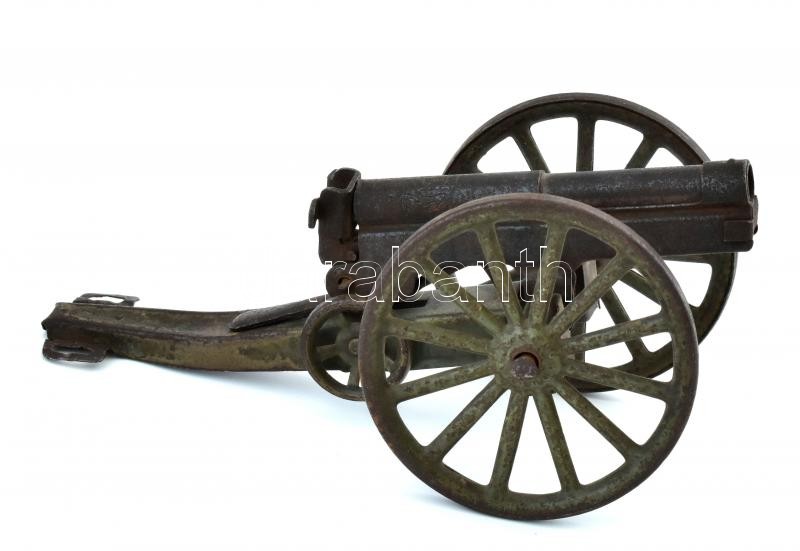 Régi fém játékágyú címerrel, rozsdafoltokkal, h: 15,5 cm