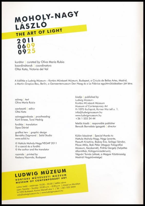 2011 Moholy Nagy László - The art of light. Szerk.: Oltai Kata. Bencsik Barnabás előszavával. Kiállítási katalógus. Bp., 2011, Ludwig Muzeum, 24 p.