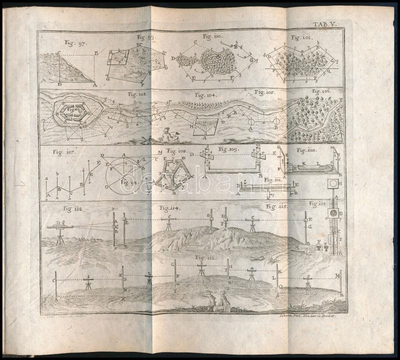 Description: [Staindl Ferenc (1750?-1818)]: Francisco Staindl: Elementa geometria practicae in usum academiarum per regnum Hungariae et provincias eidem adnexas. Budae, 1818, Typis Regiae Unveristatis Hungaricae, 4+125 p. + IV (rézmetszetű, kihajtható táblák) t. Latin nyelven. Korabeli kopott papírkötésben, az I. tábla hiányzik.