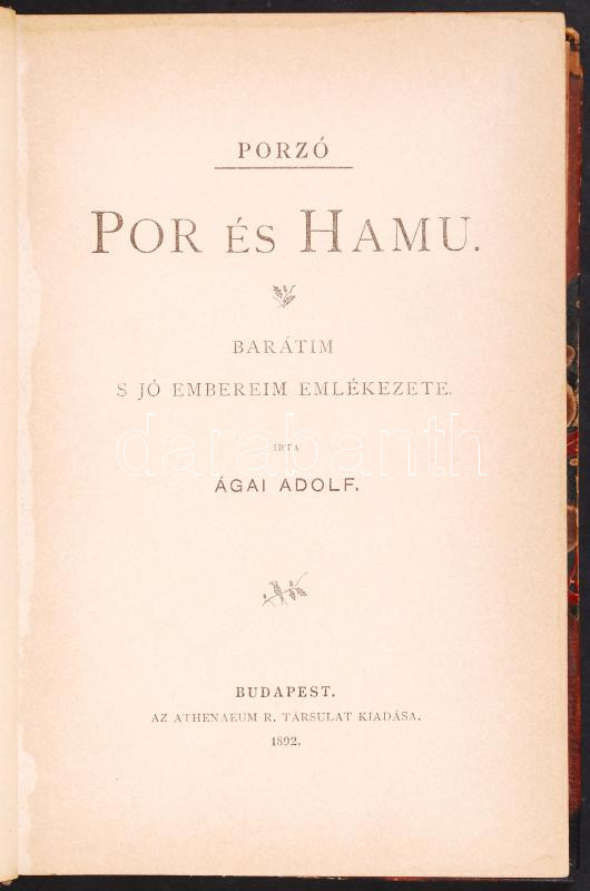 Ágai Adolf: Por és hamu. Barátim s jó embereim emlékezete. Bp., 1892, Athenaeum. Bordázott gerincű félbőr kötés, gerincnél szakadt, jó állapotban.