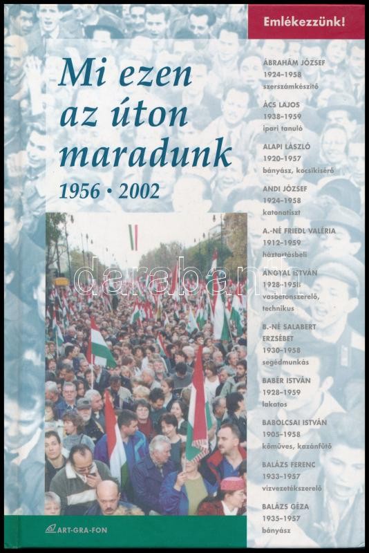 Mi ezen az úton maradunk. (1956-2002.) Szerk.: Dózsa Tamás. hn., 2002.... https://www.darabanth.com/en/412-Online-auction/412.0/Books/Books-Other-rarities~1000025/Mi-ezen-az-uton-maradunk-1956-2002-Szerk-Dozsa-Tamas-hn-2002-Art-Gra-Fon-56-p-Kiado~II2566515
