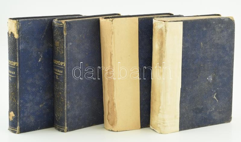 Petőfi Sándor költeményei 4 kötetben: Petőfi Sándor összes költeményei. 1842-1846. I-II. kötet. Pest, 1862, Emich Gusztáv, 1 t. (címkép, acélmetszet, Barabás Miklós-Tyroler József mellképe a költőről) +2+390+4 p., 3+369+8 p. + Petőfi Sándor újabb költeményei. 1847-1849. I-II. kötet. Pest, 1861, Emich Gusztáv, 284+IV p., 288+IV p. Egészvászon-kötés, sérült, viseltes állapotban, foltos, sérült borítóval, foltos lapokkal, két kötet javított gerinccel.