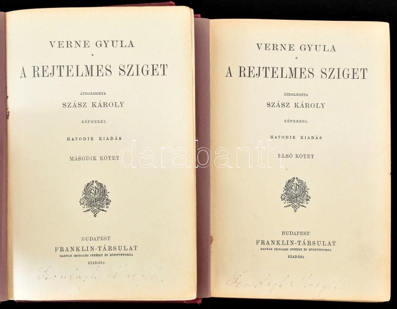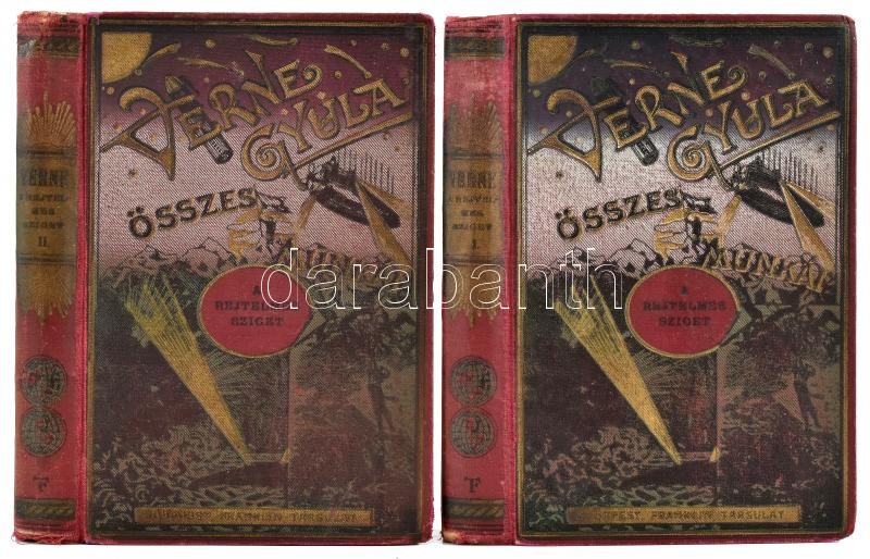 Verne Gyula: A rejtelmes sziget. I-II. köt. Átdolg. Szász Károly. Bp.,[1924], Franklin, 194; 195-408 p. Hatodik kiadás. Számos fekete-fehér illusztrációval. Kiadói aranyozott, festett egészvászon-kötésben, kopott borítókkal, laza kötésekkel, hiányzó hátsó szennylapokkal, a címlapokon halvány névbejegyzésekkel.