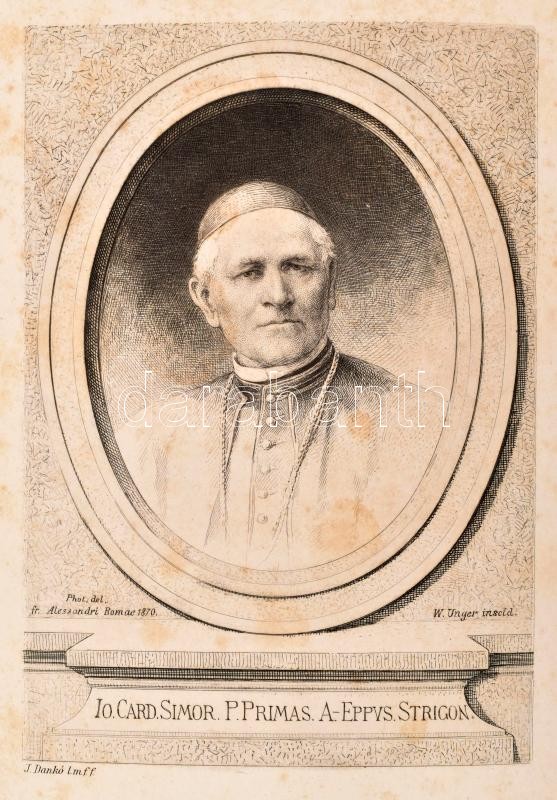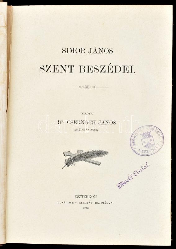 Csernoch János: Simor János szent beszédei. Esztergom, 1892., Buzárovits Gusztáv, 1 ( Simor János, címkép) t.+XXI+2+487 p. Korabeli átkötött félvászon-kötés, a borítón kopásnyomokkal, a gerincen kis sérüléssel, intézményi és névbélyegzőkkel, foltos címképpel.
