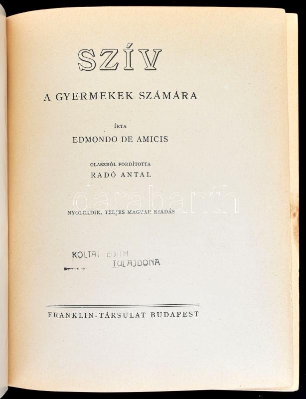Edmondo de Amicis: A szív. A gyermekek számára. Ford.: Radó Antal. Bp.... https://www.darabanth.com/en/412-Online-auction/412.0/Books/Books-Tales~1000024/Edmondo-de-Amicis-A-sziv-A-gyermekek-szamara-Ford-Rado-Antal-Bp-1933-Franklin-1-tplus27~II2568288